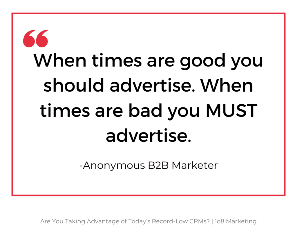 Finally, when your competitors don’t advertise, ad costs are lower. And lower CPMs lead to higher campaign efficiency/success. Frankly, you get better returns on lower ad spend. All-sized companies have a tremendous opportunity during a slump to launch disruptive advertising campaigns. Today’s CPMs speak to this.