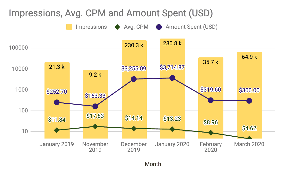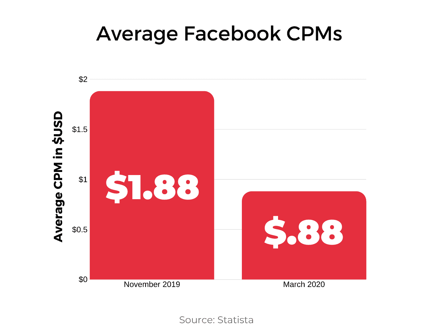 According to Statista, the average Facebook CPM dropped in March, 2020 to $0.81 from November 2019 when average CPM was $1.88. These numbers suggest that advertising on Facebook has become less expensive.