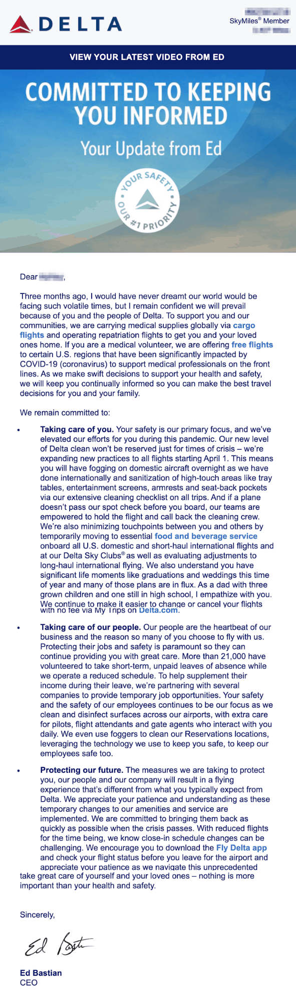 Delta Airlines has every reason to freak out. Instead, they’re keeping their message positive. Check out this message from March 29, 2020: