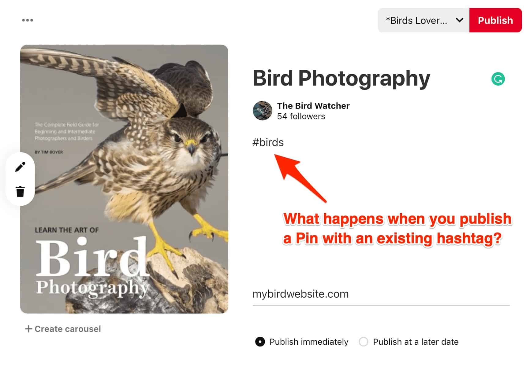 But, why on earth would you want to do this? Here’s where your mind will be blown. Okay, so imagine that you create a Pin with the existing hashtag, “#birds.”